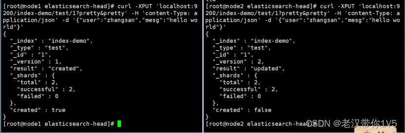 [root@node1 ~]# curl -XPUT 'localhost:9200/index-demo/test/1?pretty&pretty' -H 'content-Type: application/json' -d '{"user":"zhangsan","mesg":"hello world"}'
