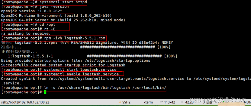 [root@apache ~]# systemctl start httpd3、安装Java环境[root@apache ~]# java -version ###如果没有装 安装yum -y install javaopenjdk version "1.8.0_181"OpenJDK Runtime Environment (build 1.8.0_181-b13)OpenJDK 64-Bit Server VM (build 25.181-b13, mixed mode)4、安装logstash上传logstash-5.5.1.rpm到/opt目录下[root@apache ~]# cd /opt[root@apache opt]# rpm -ivh logstash-5.5.1.rpm ##安装logstash[root@apache opt]# systemctl start logstash.service ##启动logstash[root@apache opt]# systemctl enable logstash.service[root@apache opt]# ln -s /usr/share/logstash/bin/logstash /usr/local/bin/ ##建立logstash软连接