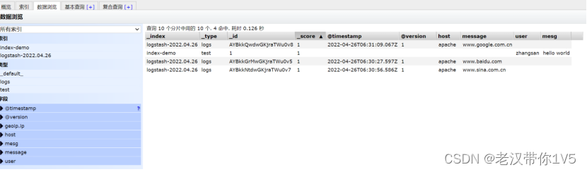 点击数据浏览--会发现在node1上创建的索引为index-demo,类型为test, 相关的信息