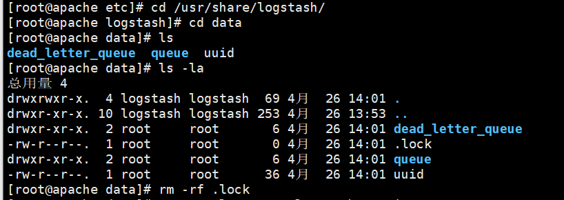 输入[root@apache conf.d]# /usr/share/logstash/bin/logstash -f apache_log.conf