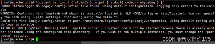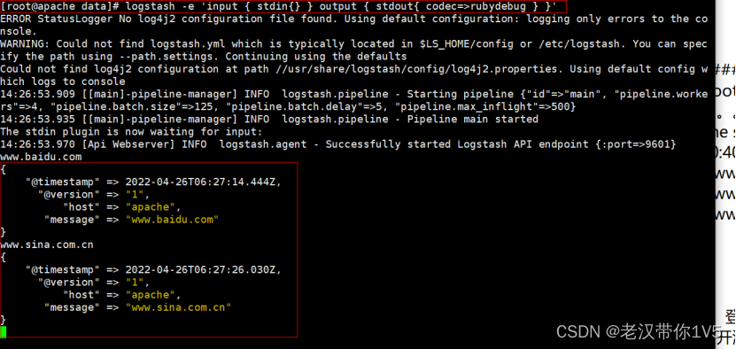 [root@apache opt]# logstash -e 'input { stdin{} } output { stdout{ codec=>rubydebug } }'