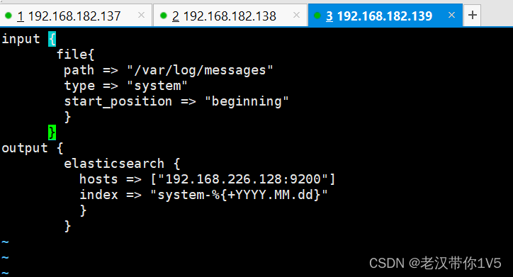 output {elasticsearch {hosts => ["192.168.182.137:9200"]index => "system-%{+YYYY.MM.dd}"}}