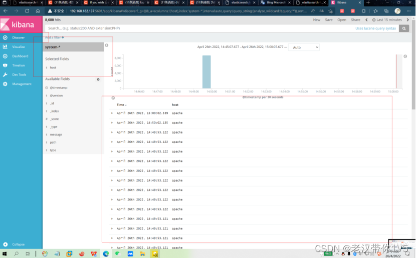 apache_error-2019.04.16 apache_access-2019.04.16 打开浏览器 输入http://192.168.182.137:5601
