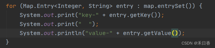 for (Map.Entry<Integer, String> entry : map.entrySet()) {System.out.print("key-" + entry.getKey());System.out.print(" ");System.out.println("value-" + entry.getValue());