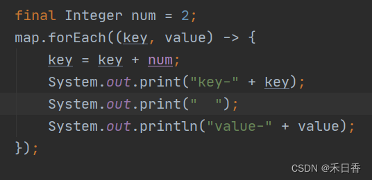map.forEach((key, value) -> {key = key + num;System.out.print("key-" + key);System.out.print(" ");System.out.println("value-" + value);