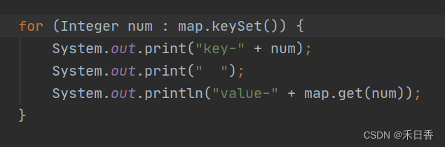 for (Integer num : map.keySet()) {System.out.print("key-" + num);System.out.print(" ");System.out.println("value-" + map.get(num));