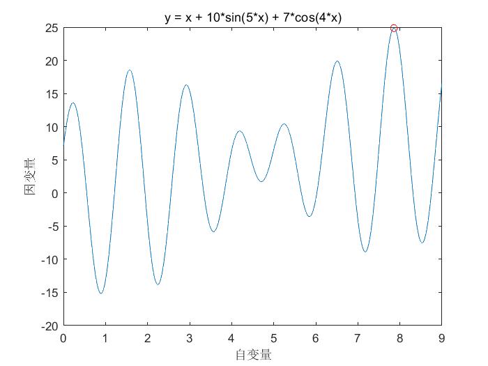 [x endPop bpop trace] = ga([0 9],'fitness',[],initPop,[1e-6 1 1],'maxGenTerm',25,...'normGeomSelect',0.08,'arithXover',2,'nonUnifMutation',[2 25 3]);%% V. 输出最优解并绘制最优点