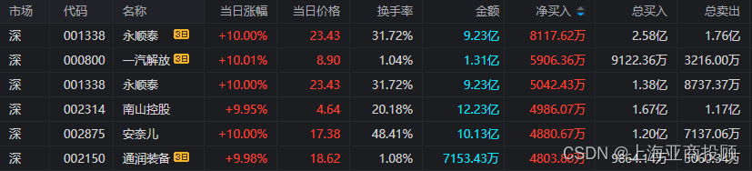 今日龙虎榜风口资金中前五只股票全部涨停。永顺泰(农产品加工)得到知名游资和一线游资的关注;一汽解放(汽车整车)得到宁波解放南游资的关注;南山控股(房地产开发)得到上海溧阳路和量化基金的关注;安奈儿(服装家纺)得到西湖国贸和量化基金的关注;通润装备(通润设备)得到游资的关注。