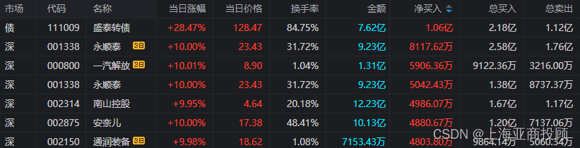 ②一汽解放(000800),资金净额买入5906万元,所属板块:汽车整车。上榜原因:连续三个交易日内,涨幅偏离值累计达20%的证券。1、公司主营业务为商用车整车的研发、生产和销售。公司目前设有2家控股子公司、1个动力总成基地和相关职能部门,现有一汽奔腾、一汽Mazda等乘用车产品系列。 2、公司在新能源领域,已实现牵引、自卸、载货及专用四大品系主流应用场景产品的全覆盖, 2023-2025 年将陆续完成商用车新能源自主电驱、电池、电控三大核心总成产品开发,实现燃料电池技术的突破,并实现整车应用。 3、公司作为军工企业,按有关规定须由中国第一汽车集团有限公司作为实际控制人保持国有控股地位。 4、公司属于国有企业。公司的实际控制人为国务院国有资产监督管理委员会。