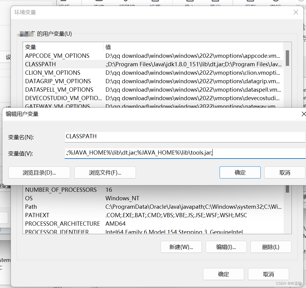 在系统变量区域,选择“新建”,输入变量名“CLASSPATH”;变量值:“.;%JAVA_HOME%\lib\dt.jar;%JAVA_HOME%\lib\tools.jar;”。请注意变量值中,前面的“点“和”分号”,可以直接复制此变量值。然后点击“确定”。