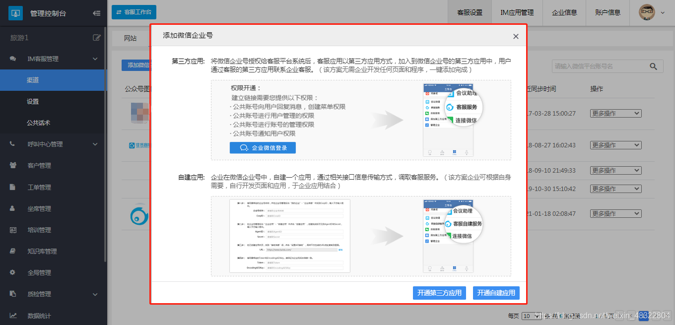 点击“IM客服管理”>“渠道” > “微信”> “添加微信应用”即可进入微信企业号渠道配置界面。企业可以绑定多个微信企业号,并将每一个微信企业号作为一个独立的信息渠道。