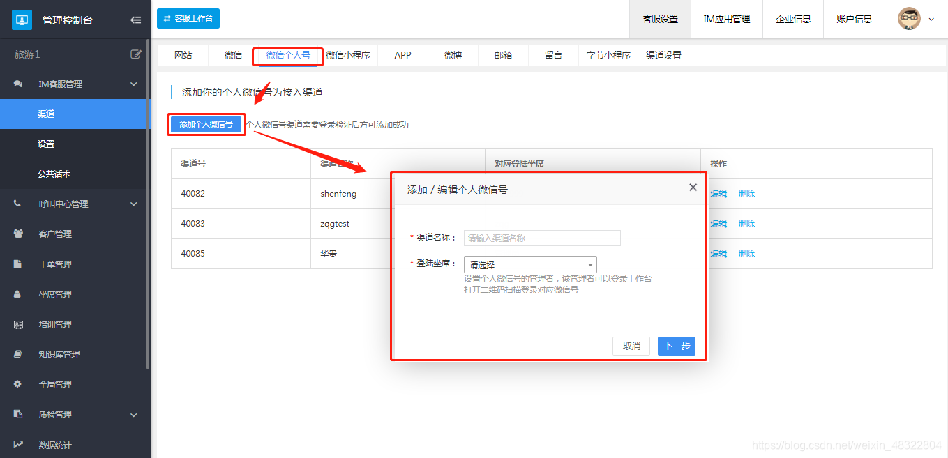 点击“IM客服管理” >“渠道”>“微信个人号”>”添加个人微信号”,填写需要被添加的微信的基本信息,并指定需要拥有被绑定微信个人号使用权限的客服人员管理此渠道。