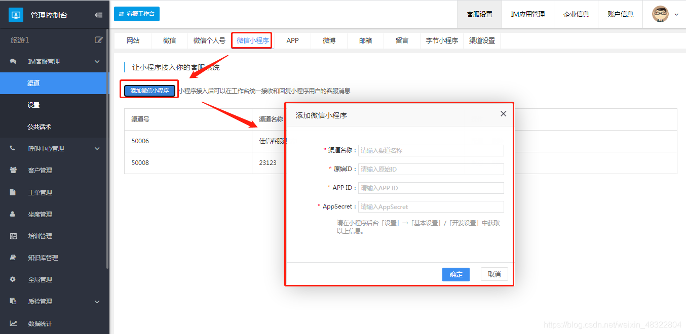 点击“IM客服管理” >“渠道”>“微信小程序”>” 添加微信小程序”,填写需要被添加的小程序的基本信息。