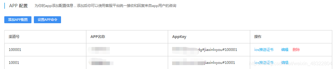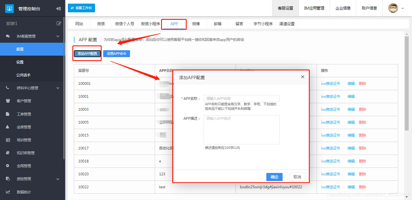 点击“IM客服管理” >“渠道”>“APP”,即可进入APP渠道配置界面。APP渠道的使用,需要开发者在APP中集成佳信客服访客SDK,通过配置不同的APPKEY来区分不同应用的渠道。