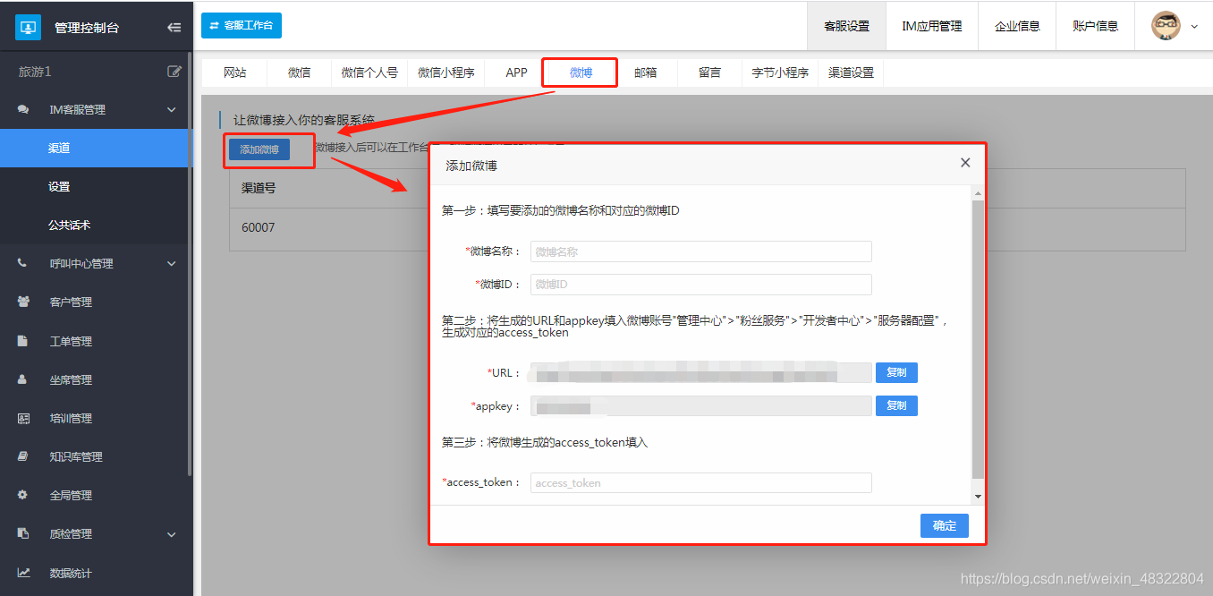 点击“IM客服管理” >“渠道”>“微博”>“ 添加微博”,填写需要被添加的微博的基本信息。将生成的URL和appkey填入微博账号"管理中心">"粉丝服务">"开发者中心">"服务器配置",生成对应的access_token,将微博生成的access_token填入,即可完成微博渠道的绑定。