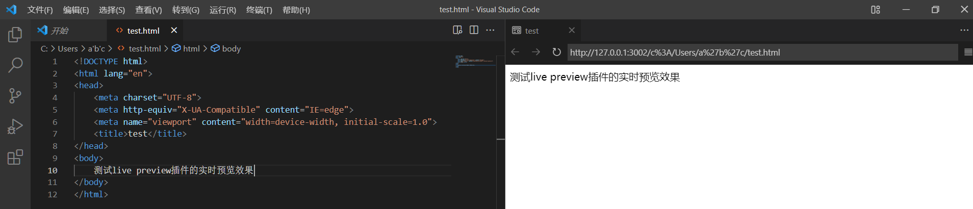 在html文件内键入文字,发现已经有了实时预览的效果。
