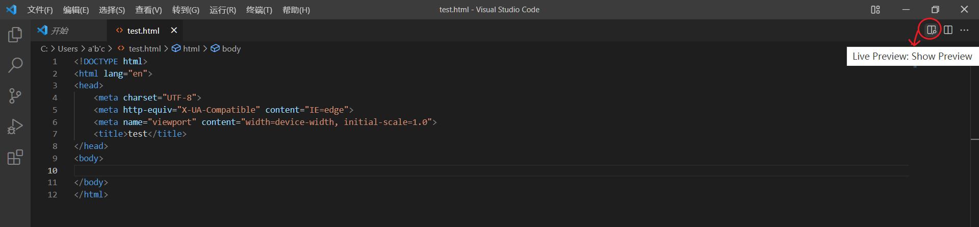 ctrl+n新建一个文件》再ctrl+s将文件保存为html文件》按!+Tab键,在html内生成基本骨架。可以看见右上角有一个图标,鼠标悬停其上会有‘show preview’的提示文本,点击该图标。可以看见preview插件页面默认出现在右侧。