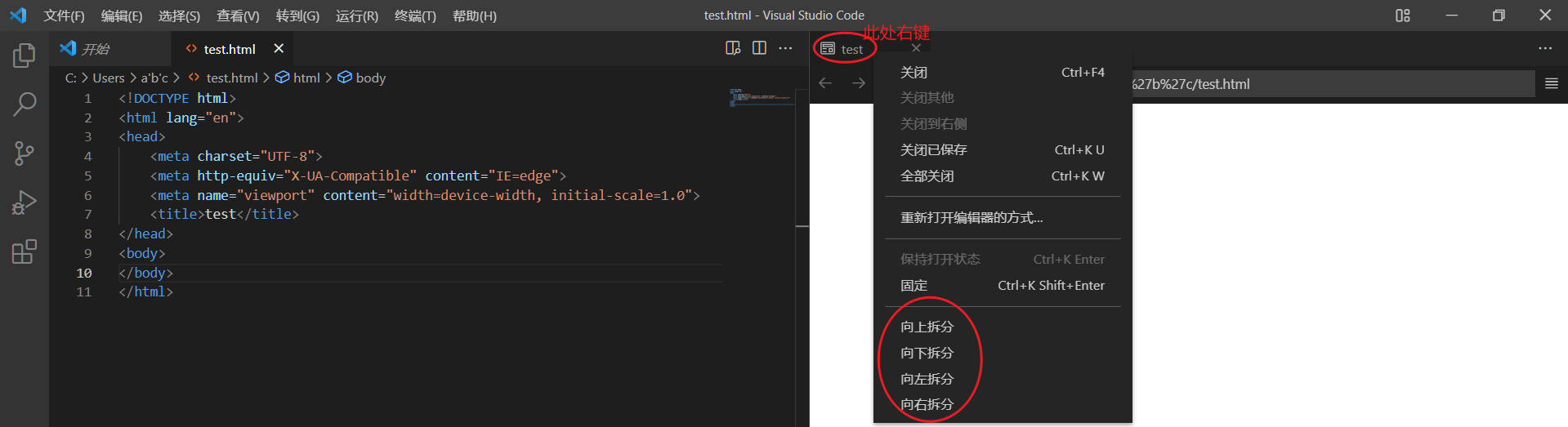 我们也可以右键顶部的文件名,选择向上/下/左/右拆分,以更改为更合适自己的页面布局。