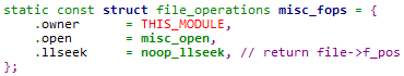 说明3:misc_fops结构体是所有misc设备共用的设备文件操作函数集,其中只实现了open和llseek函数。之所以可以这么做,是因为后续会使用各个misc设备自己的file_operations结构体替换file结构体中的f_op指针指向,详见后文分析