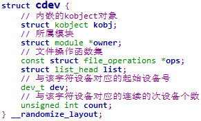 ① 此处count字段的含义与分配注册设备号时的count参数是类似的,一个cdev结构体可以支持多个主设备号相同的字符设备,count字段就表示一个cdev结构体可以支持的次设备号连续的设备个数