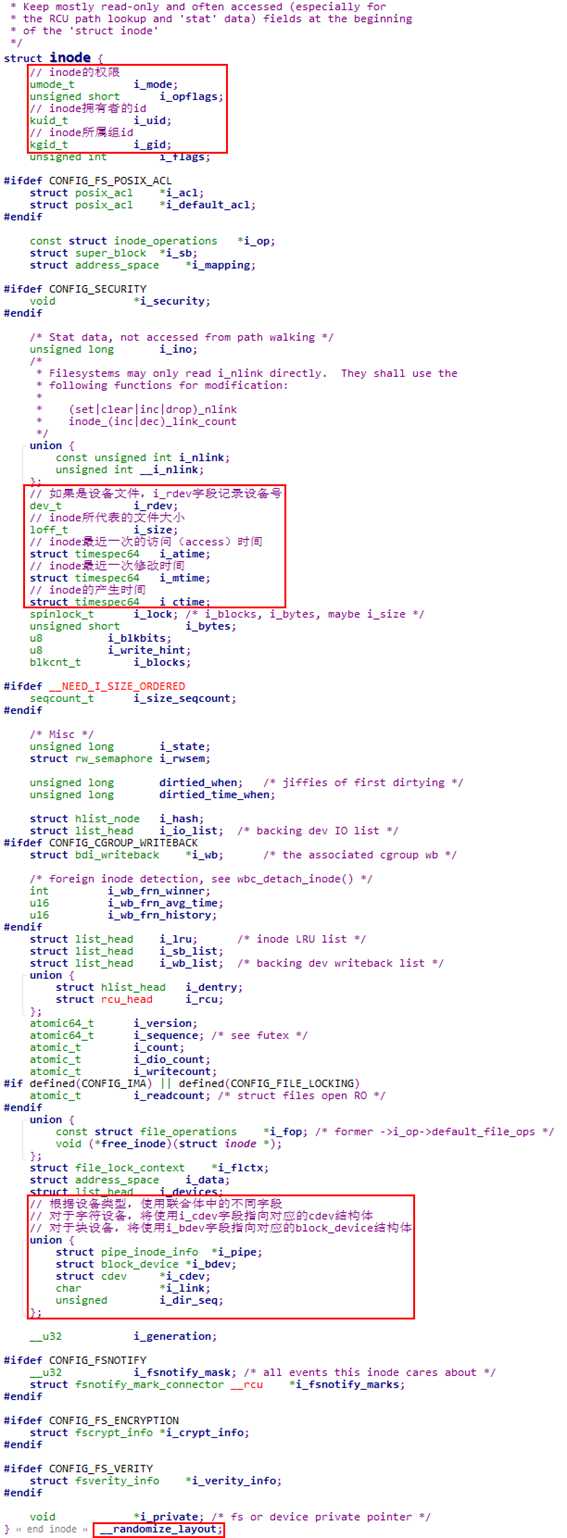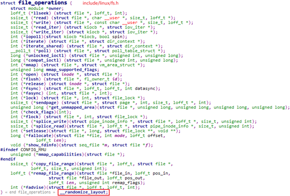 在定义inode结构体类型时,使用了__randomize_layout宏进行修饰,这是GCC的一个plugin提供的特性。该特性可以对结构体进行混淆。在编译时,结构体中的数据不会按照声明顺序存储,而是根据函数名以及随机化种子打乱存储顺序,目的是防止黑客程序计算出结构体中关键值的偏移并进行修改