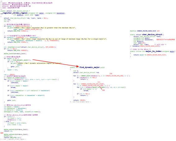 通过对__register_chrdev_region函数的分析,可以理解字符设备有效主设备号的个数以及对主设备号的组织方式