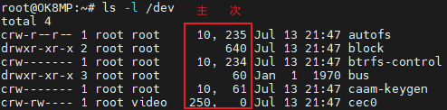 ⑤ 使用cat /proc/devices命令可以查看系统中已经使用的字符设备和块设备的主设备号