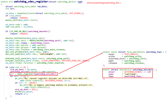 在Linux内核的watchdog子系统中,当要注册的watchdog_device.id为0时,会注册watchdog_miscdev设备