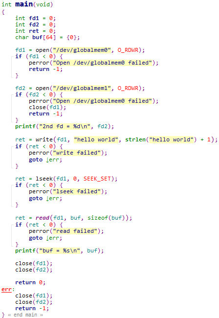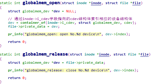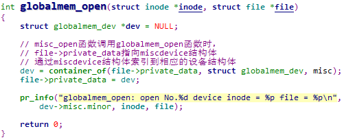 说明:globalmem_open函数中的inode->i_cdev就是指向与该文件节点关联的cdev结构体,而该cdev结构体又被包含在设备结构体中。因此,通过container_of宏就可以索引到相应的设备结构体。关于container_of宏的实现,可参考01. 概述 chapter 6.2