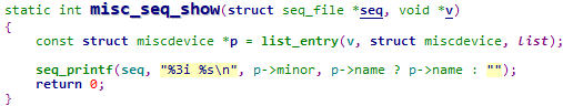 这点虽然在创建misc设备节点的过程中没有问题,但是在通过cat /proc/misc命令列出当前系统中的misc设备时,会触发段错误