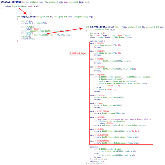说明3:从do_vfs_ioctl函数可见,内核中预定义了一些控制命令(e.g.FIOCLEX)。如果设备驱动中包含了与预定义命令一样的命令码,这些命令会作为预定义命令被内核处理,而不是被设备驱动处理