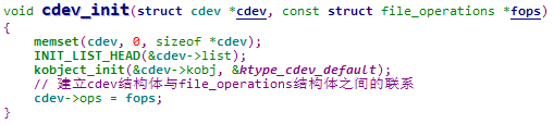 cdev_init函数用于初始化cdev结构体成员,并建立cdev结构体和file_operations结构体之间的联系