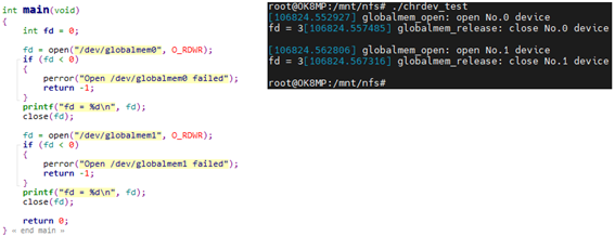 运行如下测试用例,可见运行符合预期,不同的inode节点可以索引到相应的cdev结构体