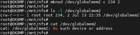 通过cat /proc/devices命令可以验证主设备号234确实被示例驱动程序占用