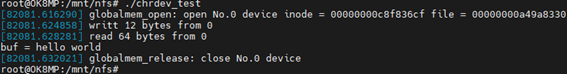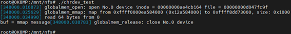运行如下测试用例,可见运行结果符合预期。需要注意的是,测试用例需要对映射后的内存进行读写操作,因此映射权限必须具有读写权限,而映射模式必须是共享模式(否则strcpy写入的数据,不会真正写入globalmem设备持有的内存中)