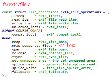 此时块设备的file_operations结构体由相应的文件系统提供,文件系统会将针对文件的读写转换为针对块设备原始扇区的读写,下图为ext4文件系统实现的file_operations结构体