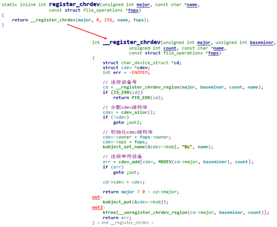 ① 上述2个函数中的参数count均表示要连续注册/分配设备号的个数,此处是指次设备号的连续