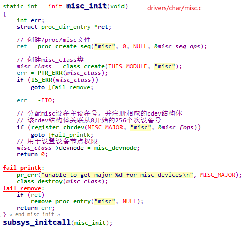 misc_init函数为misc子系统的初始化函数,该函数以subsys_initcall(".initcall4.init")等级在系统初始化过程中被调用