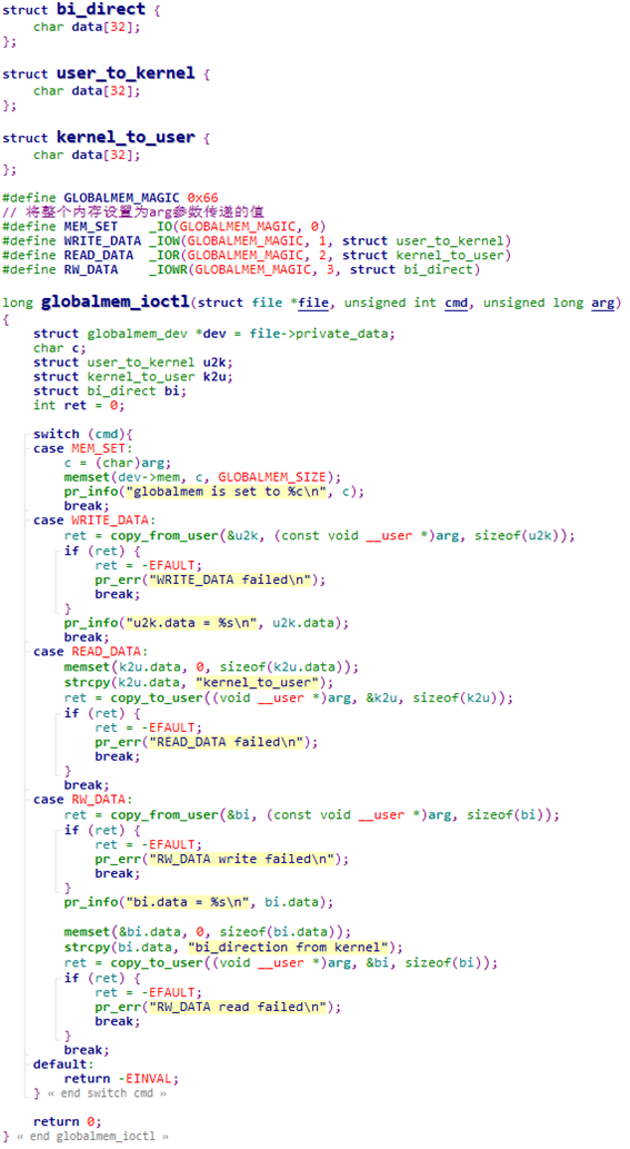 ④ 如果要拷贝到内核空间的是简单类型(e.g. char / int / long),可以使用get_user函数(也是经常用于unlocked_ioctl函数实现)。get_user函数成功时返回0,出错时返回-EFAULT