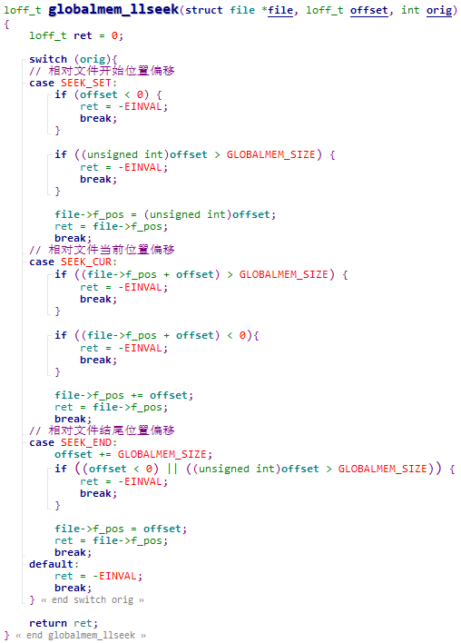 /** file: 打开的设备文件* offset: 文件偏移量* orig: 文件偏移量计算基准,* 可以是SEEK_SET(基于文件开头) / SEEK_CUR(基于文件当前位置) / SEEK_END(基于文件结尾)* 返回值: 成功时应返回新的文件读写位置,出错时应返回错误码*/loff_t llseek(struct file *file, loff_t offset, int orig); 说明1:llseek函数调用关系