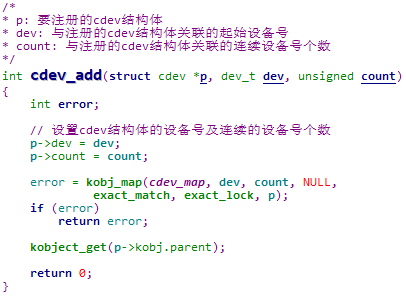 在完成cdev结构体的初始化之后,就可以调用cdev_add函数向系统中注册字符设备