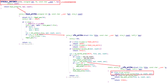 从调用关系中可见,如果write函数未被实现,当用户进行write系统调用时,会返回-EINVAL