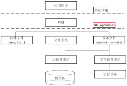 应用程序和VFS之间的接口是系统调用;VFS和文件系统以及设备文件之间的接口是file_operations结构体中的成员函数,该结构体包含对文件进行打开、关闭、读写和控制的一系列成员函数