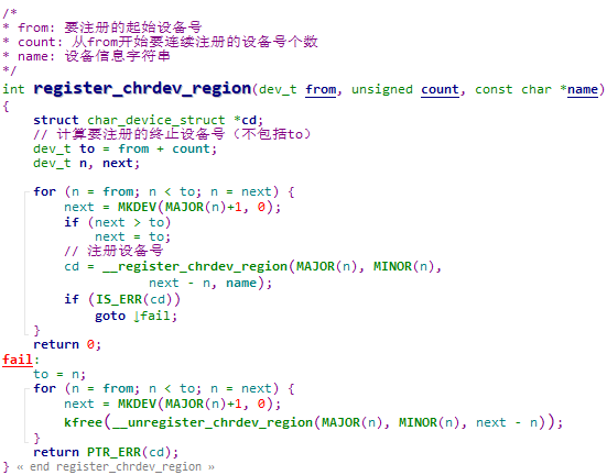 ② 假设注册分配的主设备号为A,次设备号为B,那么将会连续注册分配从MKDEV(A, B)到MKDEV(A, B + count - 1)的设备号