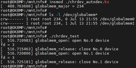 加载chrdev_audodev.ko,可见设备节点被自动创建,运行测试用例结果与之前相同
