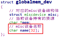 ⑤ 这种直接使用字符串字面值设置name字段的方式比较缺乏灵活性,一种可行的方案是将存储misc设备的name的字符数组定义在设备结构体中。然后在模块加载函数中设置设备结构体中的字符数组,并使用该数组设置miscdevice结构体的name字段