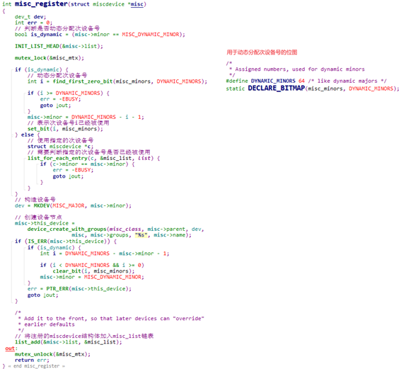 misc_register函数用于向内核注册misc设备,并且利用Linux设备模块自动创建设备节点