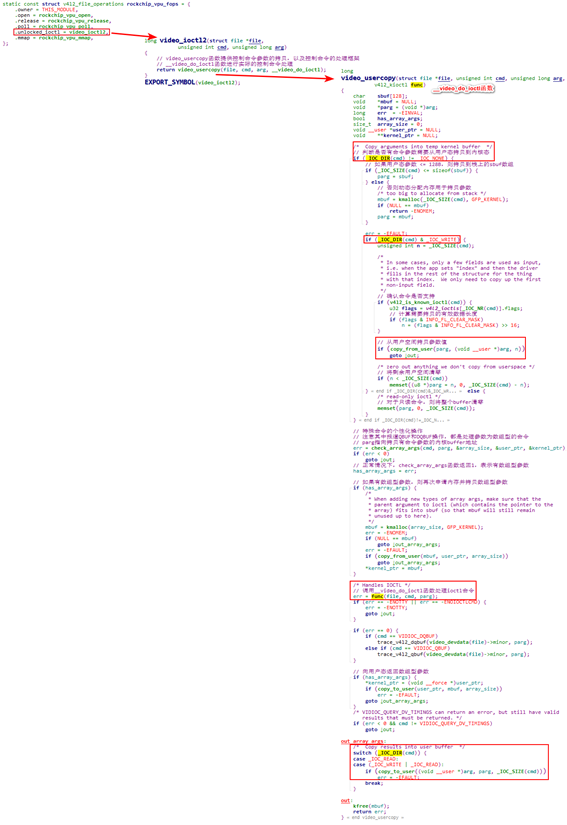 说明:由于unlocked_ioctl函数可能需要在用户态和内核态之间拷贝控制命令参数,因此内核中的一些框架会对其进行封装,以便统一处理。以V4L2框架为例,由video_usercopy函数实现控制命令的处理框架
