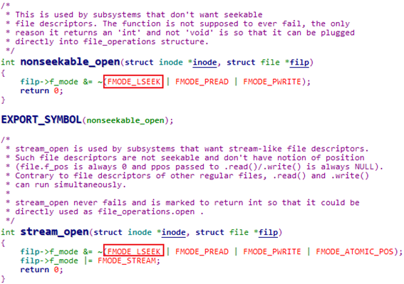 ① 在设备驱动的open函数中调用noseekable_open函数,清除file.f_mode中的FMODE_LSEEK标志