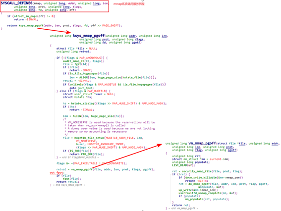 /** file: 打开的设备文件* vma: 内核分配的虚拟存储区,也就是要映射到进程虚拟地址空间中的目标范围* 返回值: 成功时应返回0,出错时应返回错误码*/int mmap(struct file *file, struct vm_area_struct *vma); 说明:mmap函数调用关系
